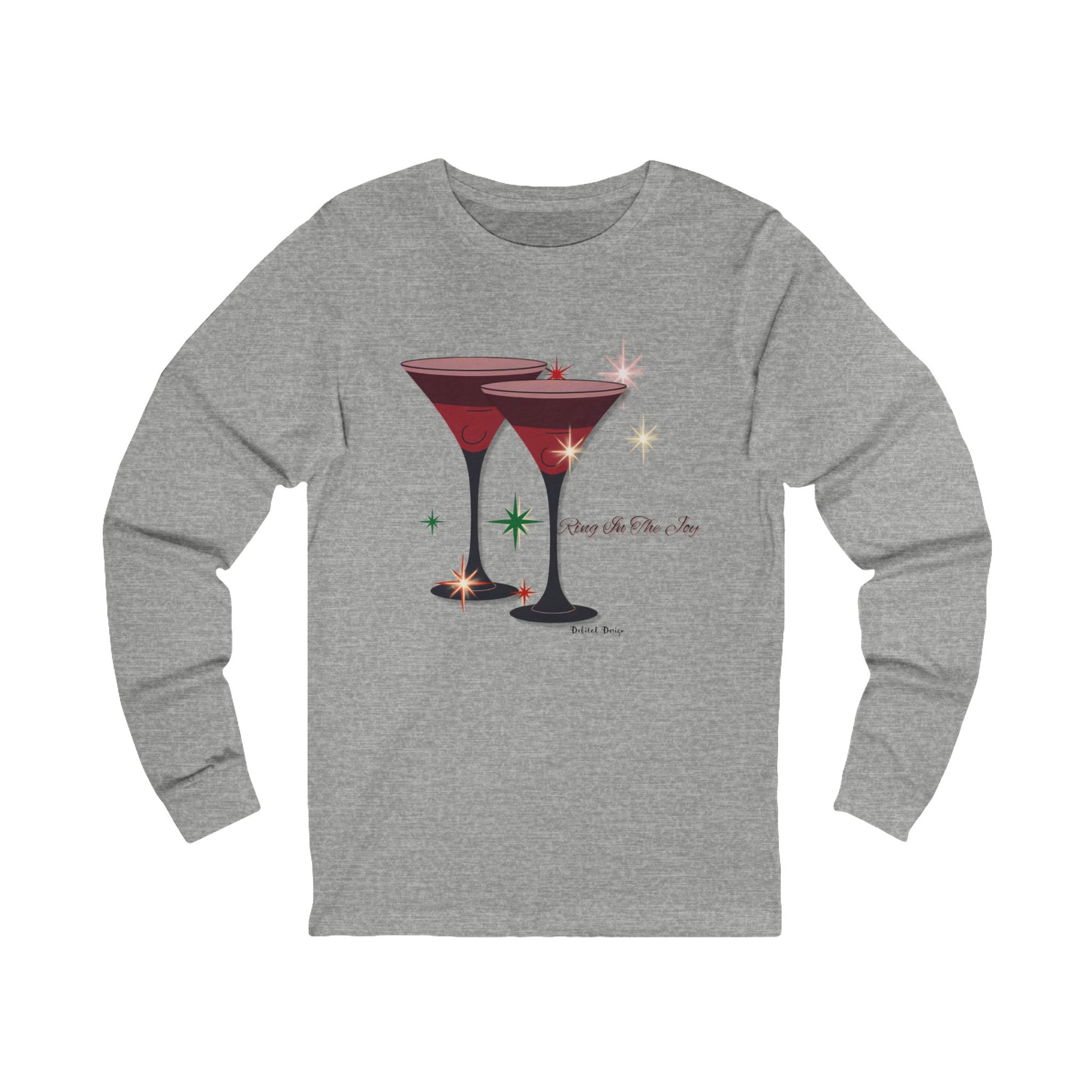 A stylish unisex jersey long sleeve T-shirt featuring two martin glasses in red with the phrase 'say ring in the joy.' This T-shirt exudes a festive and celebratory vibe, perfect for holiday parties and gatherings. It is relevant to adults looking to add a touch of fun to their wardrobe during the festive season.