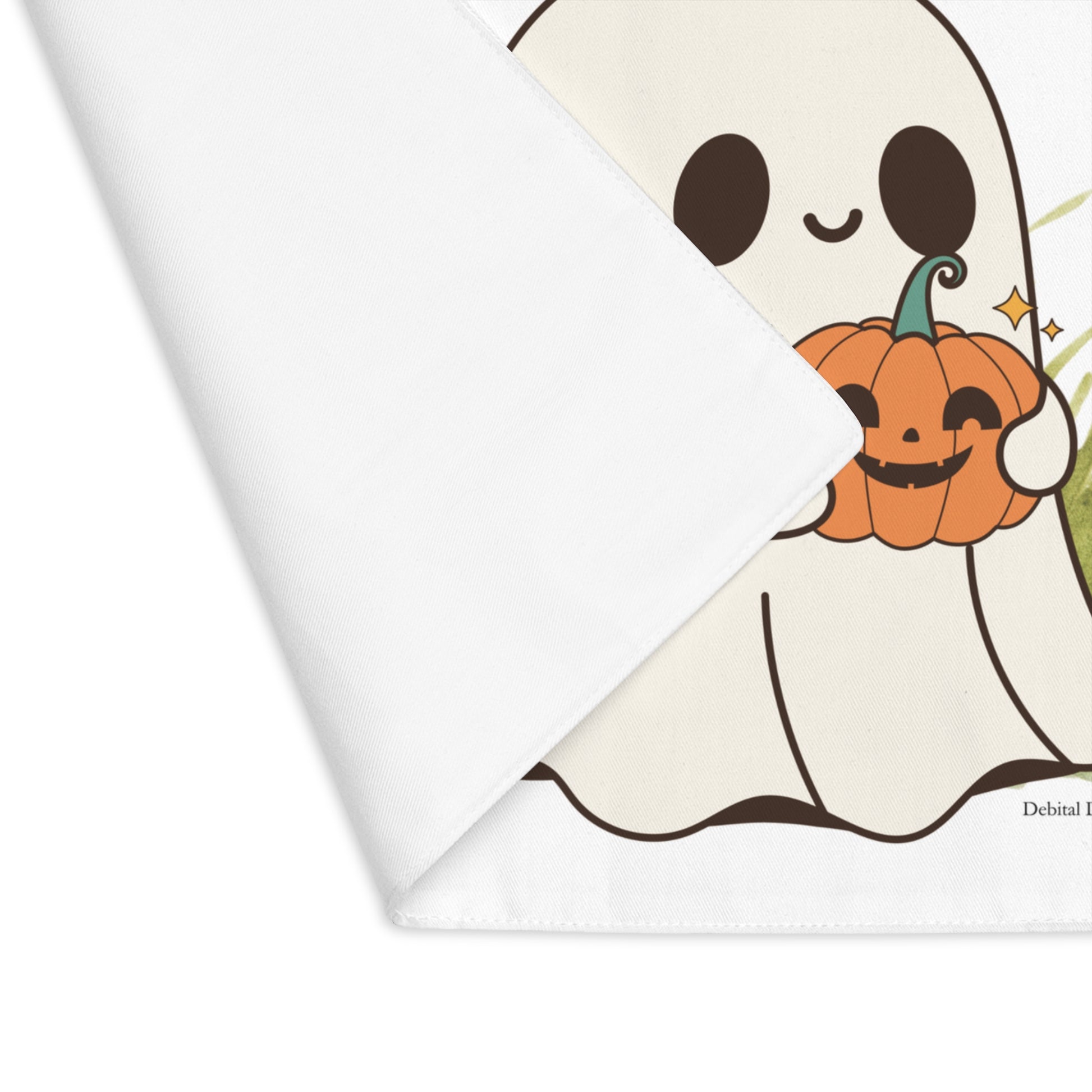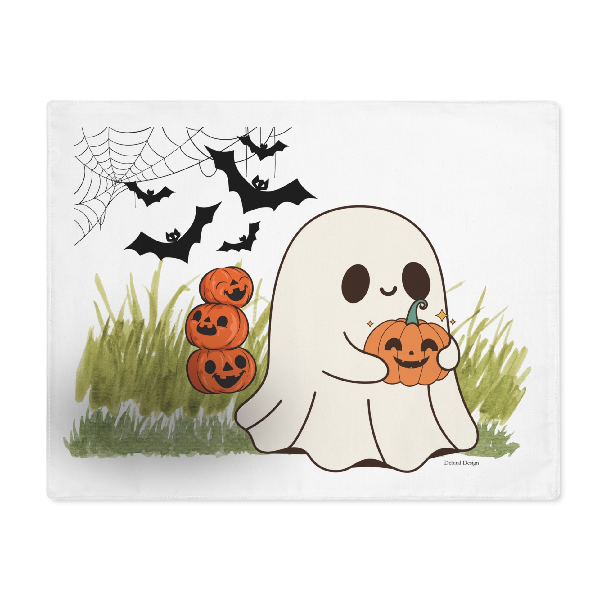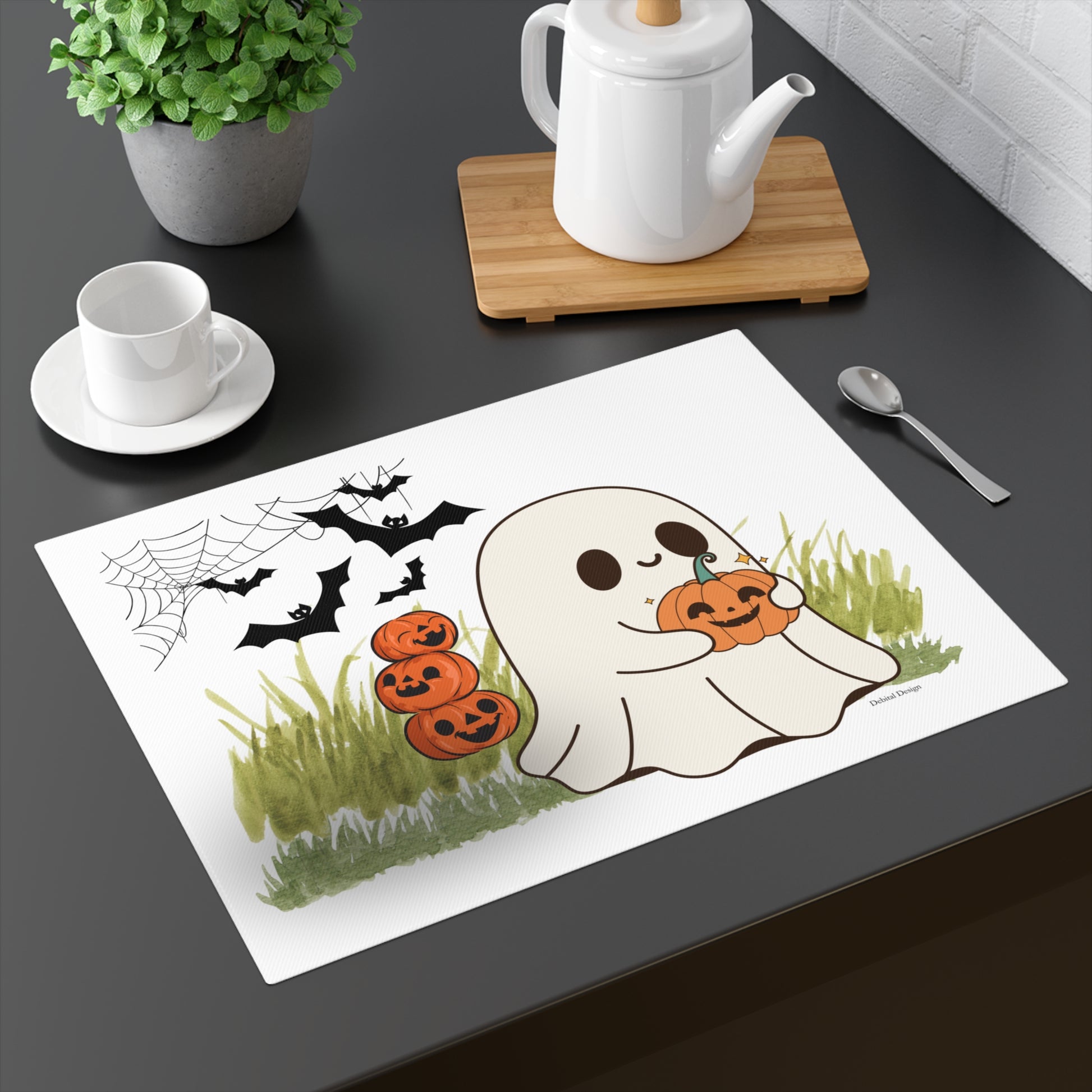 Add a spooky touch to your dining table with this ghost, pumpkin, and bats placemat. Perfect for Halloween enthusiasts looking to set a festive atmosphere.