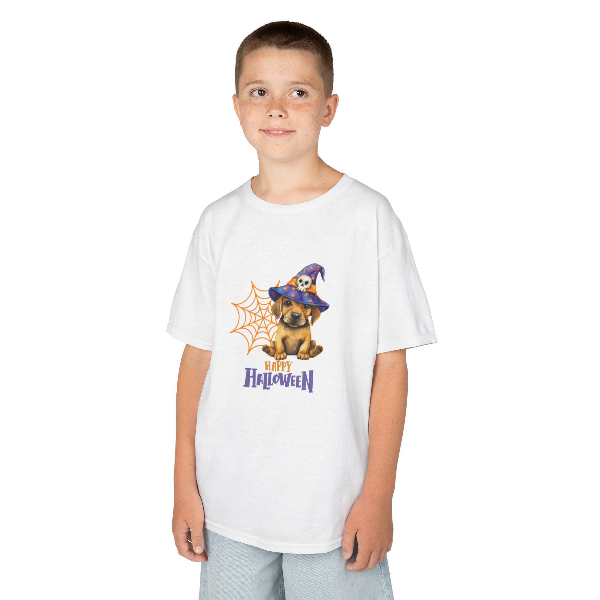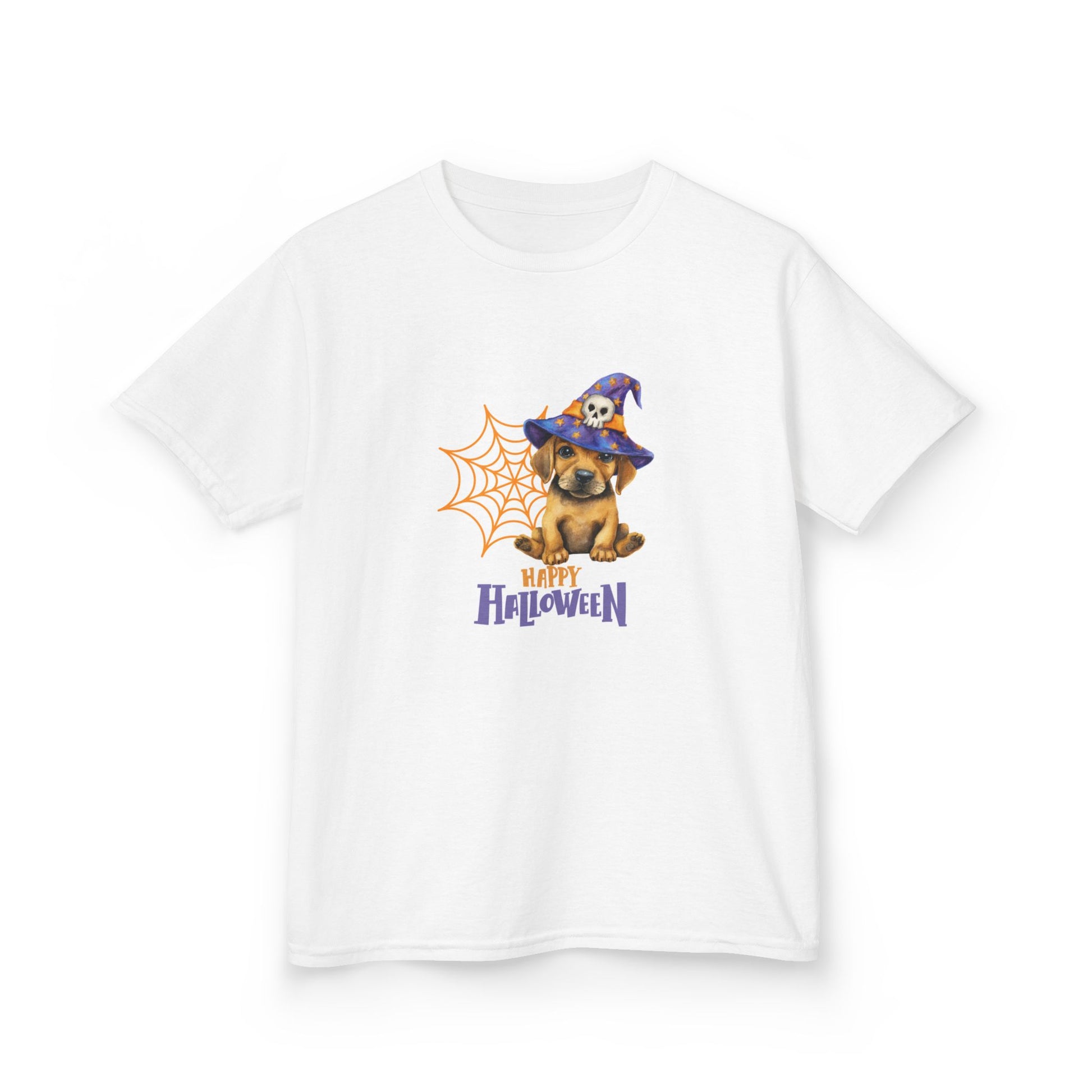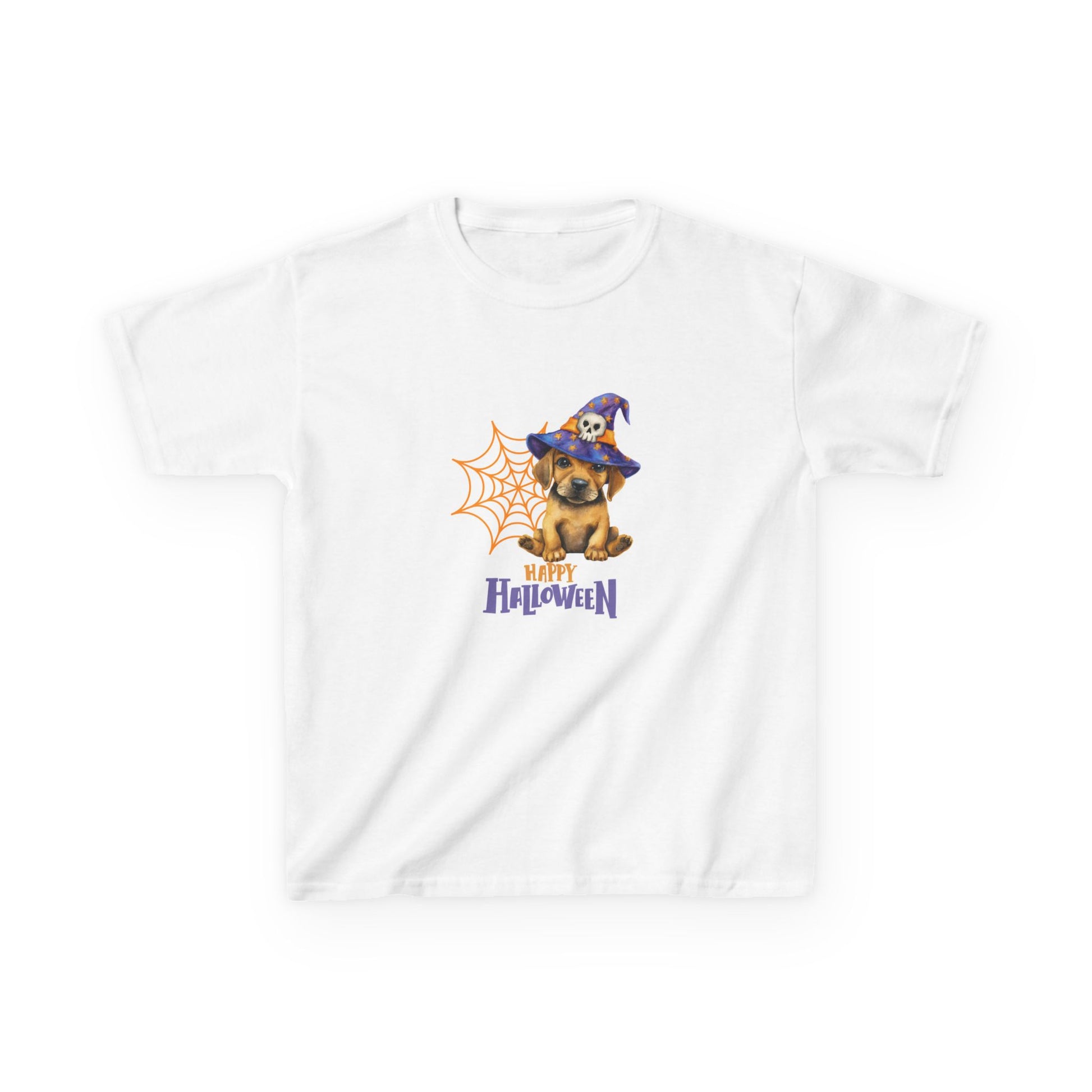 This adorable kids tee features a playful design of a puppy wearing a witches hat, perfect for adding a touch of whimsy to any child's wardrobe. The shirt is made with high-quality, soft US cotton, making it comfortable for daily wear. Ideal for children who love cute and fun graphics, this tee is perfect for Halloween or any casual occasion.